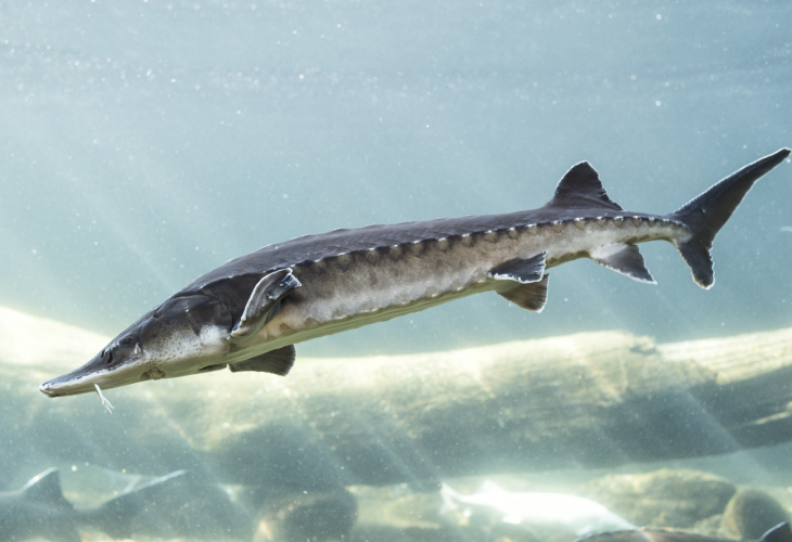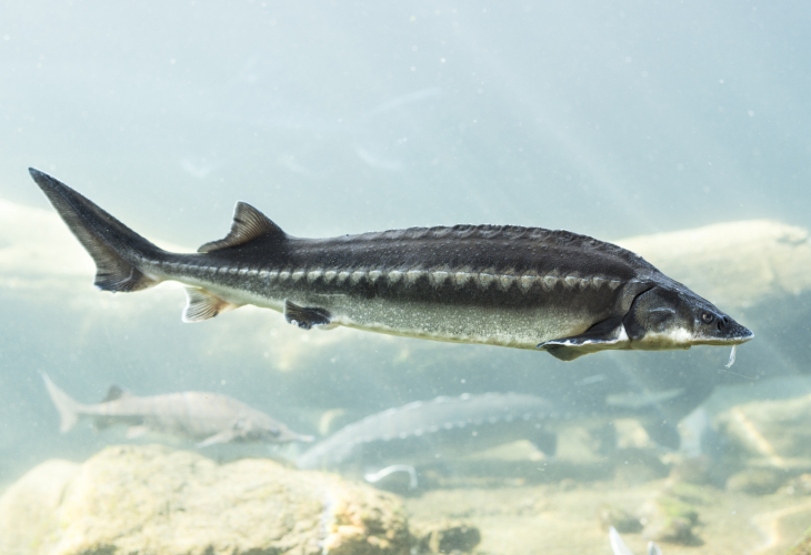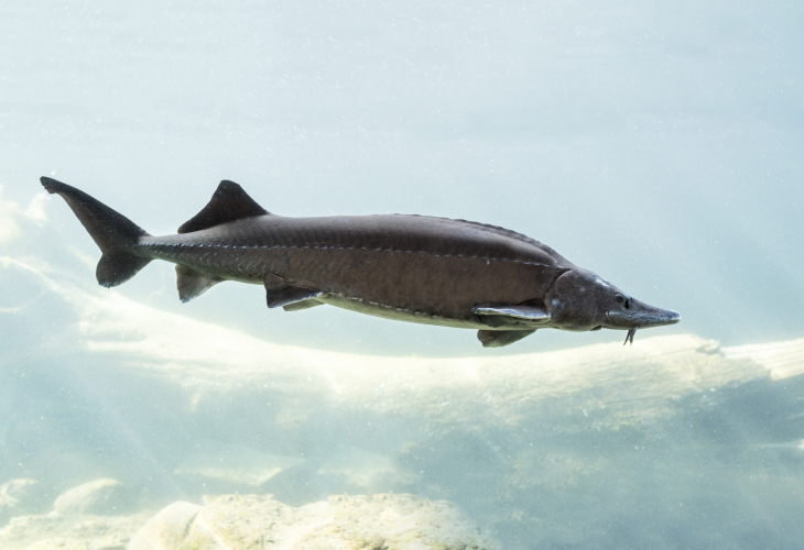 The Siberian sturgeons in Frutigen originally came from Russian Siberia, and primarily live in fresh water. Siberian sturgeon can reach an age of up to 60 years, measure up to 2 metres in length and can weigh almost 200 kilograms. The elongated, spindle-shaped body is held by five rows of bony plates on the side of the body. The symmetrical tail is also an indication of the remarkable age of the sturgeon family, which has been in existence for more than 200 million years. It detects its food, mainly insect larvae, worms and small crustaceans with its four barbels (taste buds) and takes them up through its beak-shaped, extended mouth. Its colour is a uniform brown to greyish-black, while the underside is mottled yellow to grey. It can be found in almost all the rivers of Siberia and in Lake Baikal. Sturgeon are considered to be migratory fish, who swim upstream to spawn. The Siberian sturgeon only spawns every 2 to 5 years.