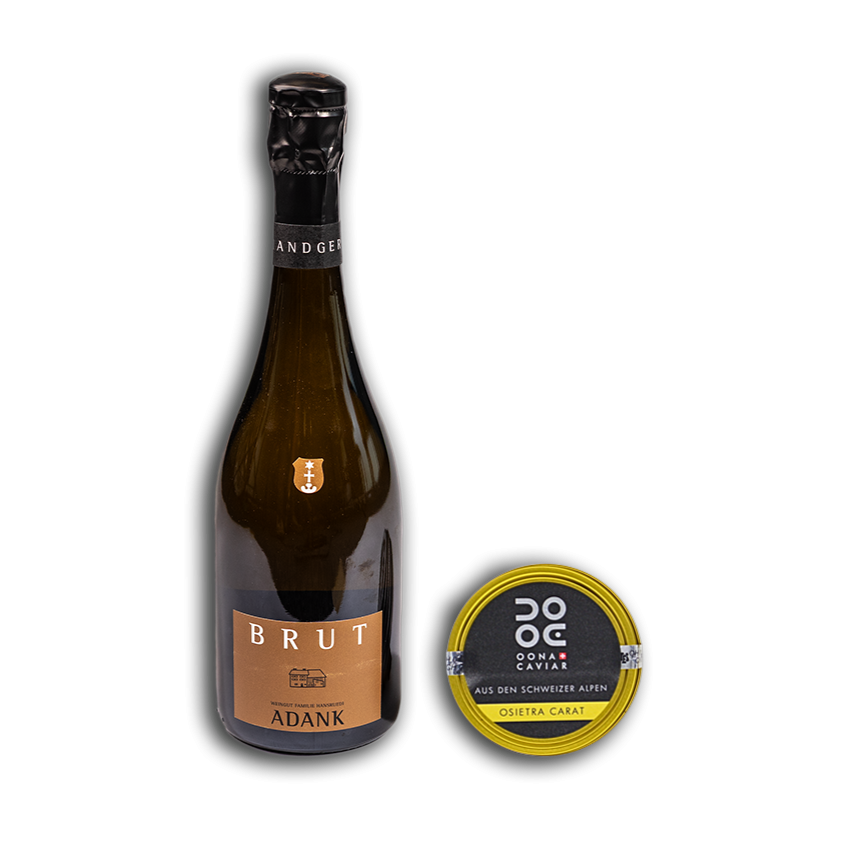 Ce coffret cadeau associe le caviar Oona Caviar Osietra Carat, d'une grande finesse, au Blanc de Noir « Adank Brut », d'une grande pureté. Le caviar séduit par son arôme harmonieux de noisette, de beurre et de mer. L'Adank Brut, avec son perlage acidulé et son élégance fraîche, en est le complément parfait.