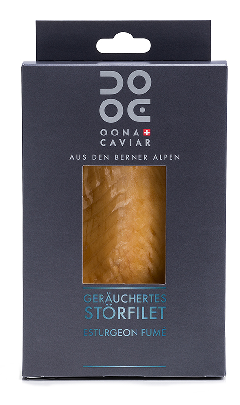 La chair d'esturgeon est fumée à chaud à 65 °C sur du bois de hêtre dans notre propre fumoir. Elle se caractérise par son goût doux et son absence d'arêtes, un signe particulier de l'esturgeon. L'esturgeon fumé se marie merveilleusement avec les salades, les pâtes, le risotto, ou peut se déguster simplement accompagné de pain grillé, légèrement beurré, et de caviar.